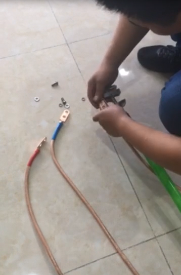 首先將鉗子的鉗臂上的螺絲取下,然后將三相短路接地線頭部螺絲口與鉗子螺絲口重合。將螺絲安裝上,三個(gè)鉗子同步此操作。如圖4;